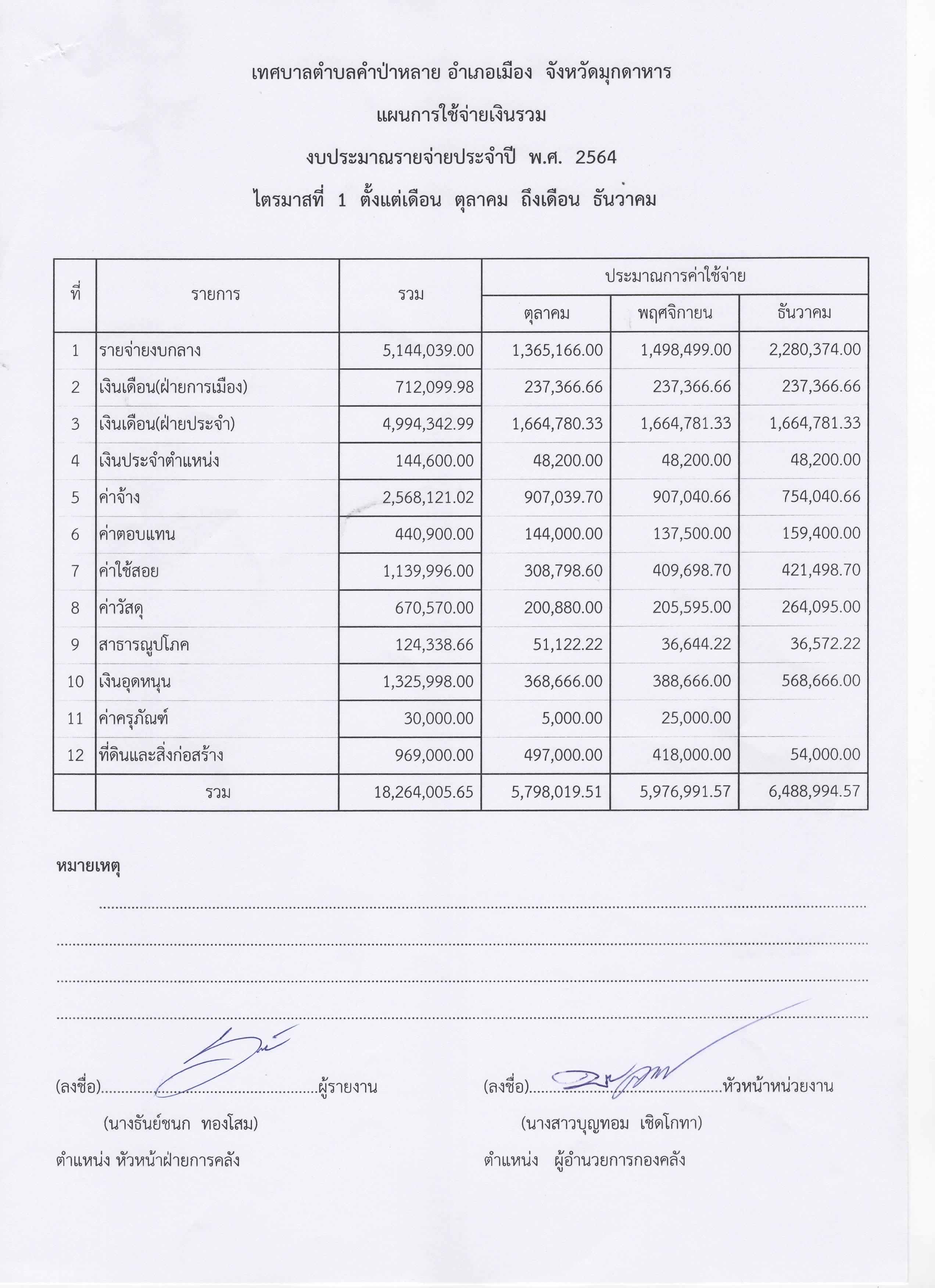 แผนการใช้จ่ายเงินรวม ไตรมาสที่ ๑ ประจำปีงบประมาณรายจ่าย ๒๕๖๔