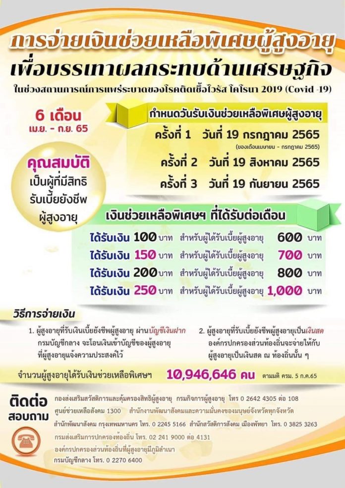 • งวดแรก จ่ายวันที่ 19 ก.ค.2565 จำนวน 4 เดือนตั้งแต่งวดเดือนเม.ย.- ก.ค.65 (ตามสิทธิที่เคยได้รับเบี้ยยังชีพ)