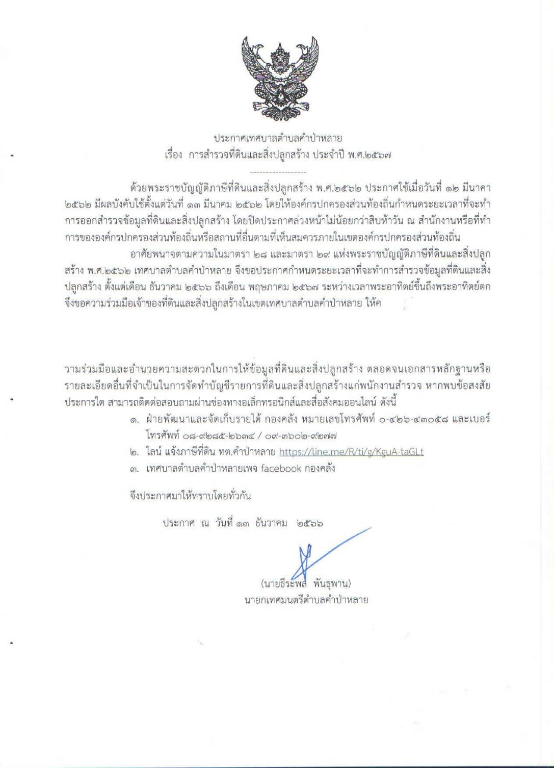 ประกาศเทศบาลตำบลคำป่าหลาย เรื่อง การสำรวจที่ดินและสิ่งปลูกสร้าง ประจำปี พ.ศ. 2567