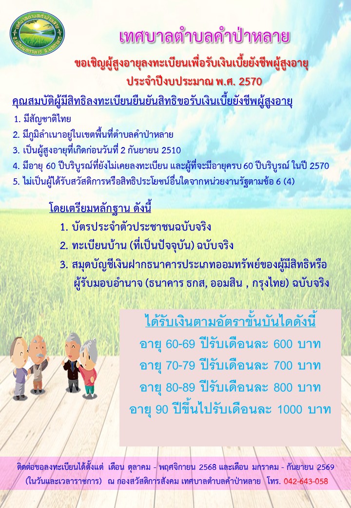 ขอเชิญผู้สูงอายุลงทะเบียนเพื่อรับเงินเบี้ยยังชีพผู้สูงอายุ ประจำปีงบประมาณ พ.ศ. 2570